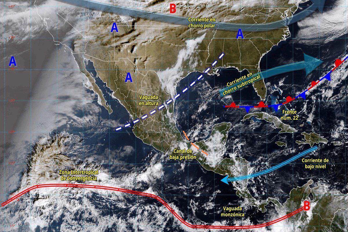 El aporte de humedad proveniente del océano Pacífico y del golfo de México favorecerá chubascos y lluvias fuertes, con precipitaciones puntuales muy fuertes en entidades del sureste y oriente.