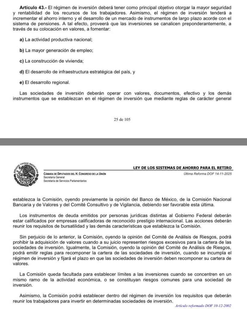 De acuerdo con el dictamen avalado, las administradoras de fondos para el retiro deberán orientar sus inversiones bajo el principio de garantizar la mayor seguridad y rentabilidad posible para los trabajadores. Sin embargo, la redacción de la reforma permite que dichos recursos se destinen a instrumentos vinculados a proyectos de infraestructura impulsados por el Estado, lo que en los hechos amplía el margen de participación del gobierno en la definición del destino de estos fondos.