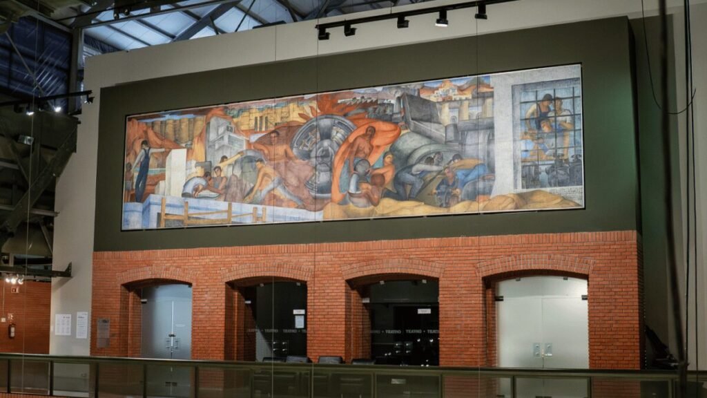 Durante tres meses, la Secretaría de Cultura de Nuevo León y el Consejo para la Cultura y las Artes de Nuevo León (CONARTE) realizaron trabajos de conservación y mantenimiento del mural “Alegoría de la Producción”, obra del muralista duranguense Fermín Revueltas, que se exhibe en la planta alta de la Nave II del Centro de las Artes, en Monterrey.