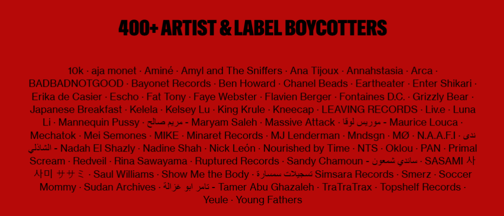 Hasta ahora, la campaña cuenta con más de 400 artistas y sellos de todo el mundo que han aceptado retirar o bloquear su música en Israel. Aquí algunos nombres destacados, y el tipo de participación que han asumido: