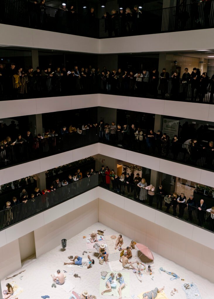 Disruptiva y performática, “Sun & Sea” combina arte y reflexión ambiental. Con la participación de trece cantantes, la pieza se desarrolla sobre un escenario cubierto por veinticinco toneladas de arena y crea la atmósfera de una playa concurrida. Mientras toman el sol, los personajes ofrecen a la audiencia una serie de armonías seductoras y narraciones melódicas. Esta ópera performance obtuvo el León de Oro a la Mejor Participación Nacional en la Bienal de Venecia en 2019.