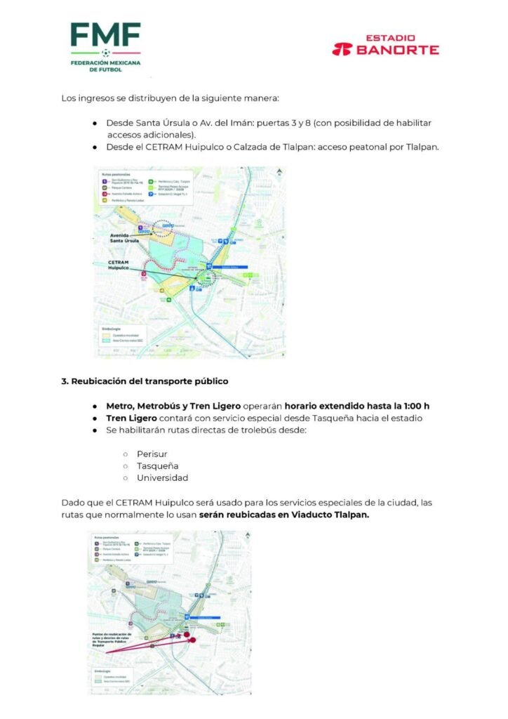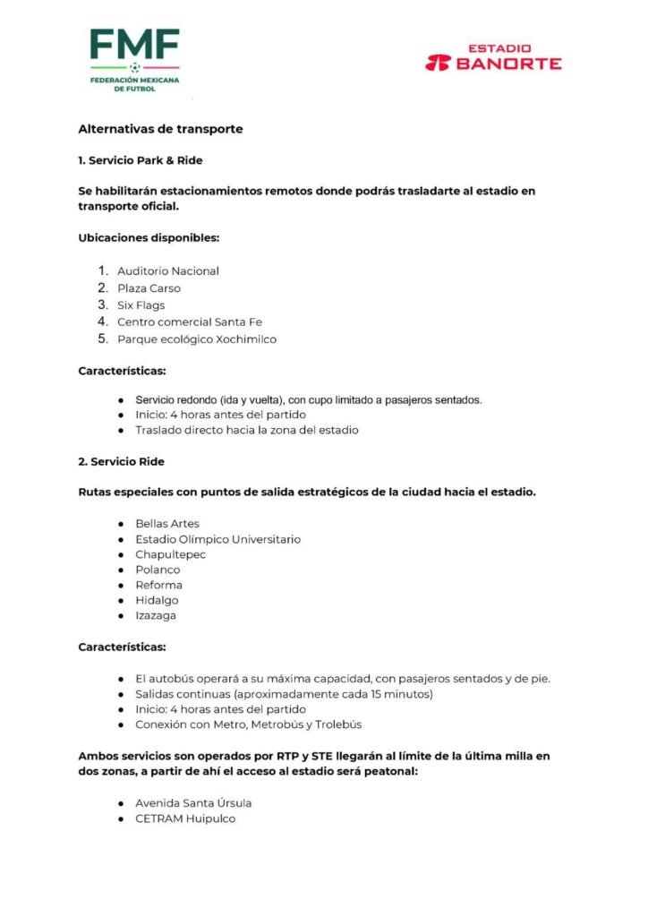 A este esquema se suma un sistema de “Park and Ride”, con salidas desde puntos como el Auditorio, Santa Fe, Six Flags, el Parque Ecológico de Xochimilco y Plaza Carso, donde los asistentes podrán dejar sus vehículos para continuar el trayecto en transporte público. También se integran 26 rutas de transporte concesionado desde el CETRAM Huipulco, que funcionará como centro de distribución de usuarios antes del acceso final al estadio.