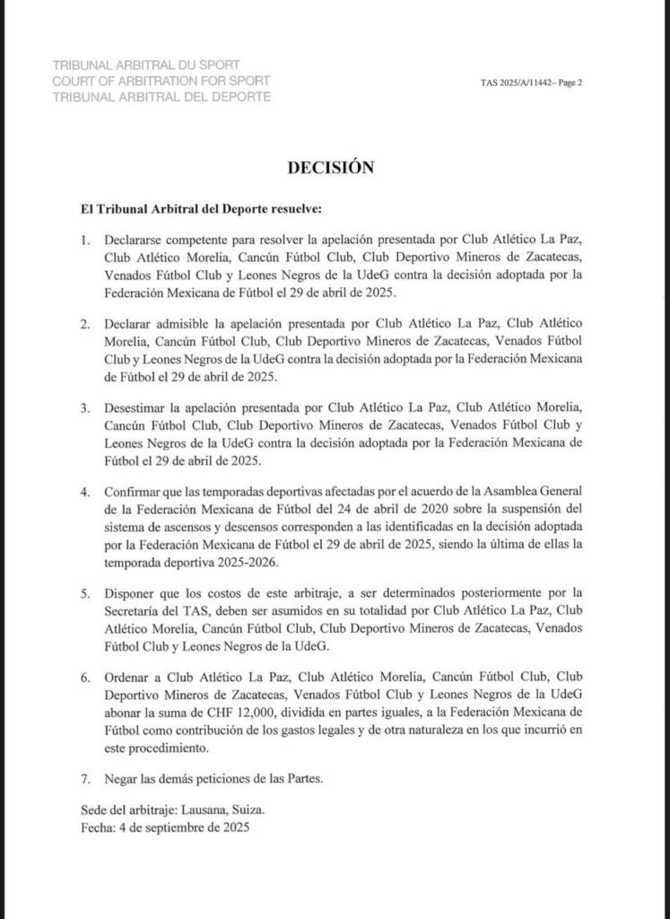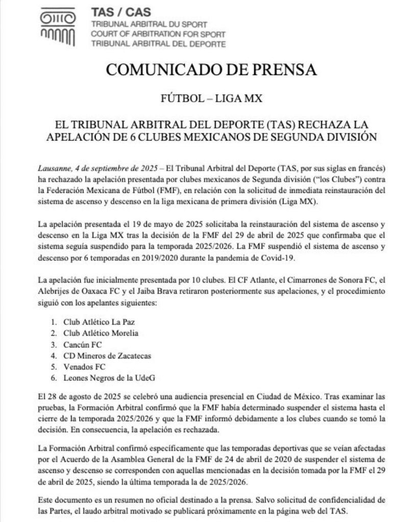 El día de hoy, el Tribunal de Arbitraje Deportivo (TAS), con sede en Lausana, emitió un fallo relevante para el sistema deportivo y jurídico del fútbol en México: rechazó la apelación presentada por seis clubes de la Liga de Expansión MX, quienes buscaban que el ascenso y descenso se restableciera de forma inmediata en la temporada 2025-2026. Al mismo tiempo, el TAS confirmó que el sistema sí regresará a partir de la temporada 2026-2027.