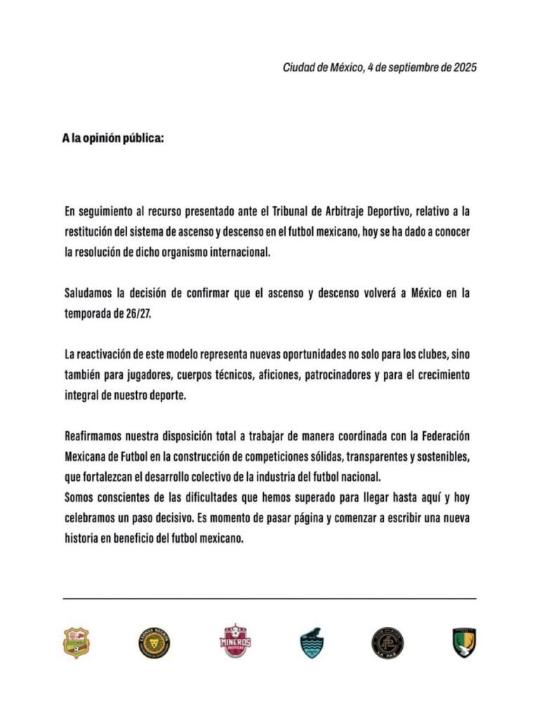 El fallo del TAS, emitido el 4 de septiembre de 2025, representa un momento decisivo para el fútbol mexicano: el ascenso y descenso queda oficialmente reinstaurado para la temporada 2026-2027, respetándose el acuerdo de suspensión pactado en 2020 y marcando el retorno de un sistema de competencia más justo y transparente. Además, avaló la certificación, lo que permitirá a la FMF extender los requisitos para que los clubes puedan ascender a la Liga MX.