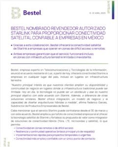 Con la alianza, Bestel se une a otros revendedores comerciales autorizados de Starlink en México como Elipgo Technology, Globalsat, Grupo GTD, Tangerine Electronics, Transcom, Apco Networks y Ubix, los cuales atienden a industrias como la minería, petróleo, comercio minorista, transporte y logística.