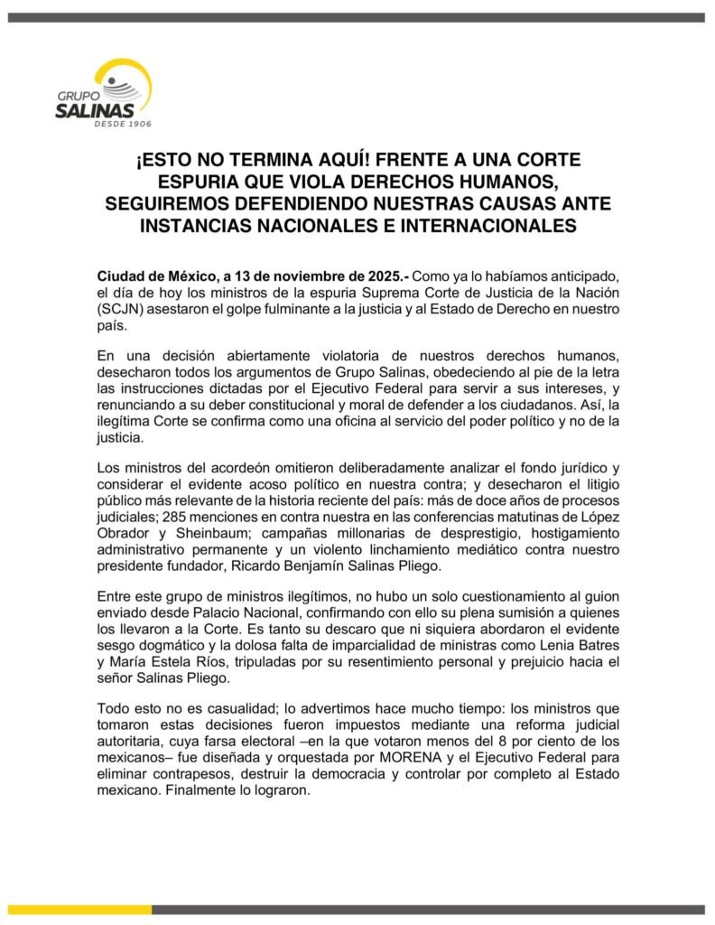 Horas más tarde, el conglomerado difundió un comunicado más amplio en el que reiteró su rechazo a las determinaciones judiciales y anunció que acudirá a tribunales internacionales para denunciar lo que considera una violación a sus derechos humanos y una persecución política. En el texto, Grupo Salinas aseguró que los ministros de la Corte “obedecieron al pie de la letra las instrucciones dictadas por el Ejecutivo Federal”, y acusó a las ministras Lenia Batres y María Estela Ríos de actuar con “sesgo dogmático” y “resentimiento personal” hacia Ricardo Salinas Pliego.