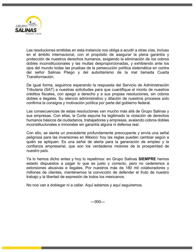 Grupo Salinas también reiteró que sus empresas “siempre han estado dispuestas a pagar lo justo y correcto”, pero no aceptarán “extorsiones abusivas e ilegales”, al tiempo que exigió al SAT precisar el monto definitivo de los créditos fiscales y eliminar lo que considera “cobros dobles inconstitucionales”.