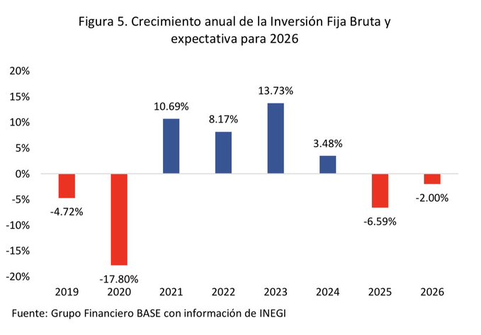 Ante este panorama, las previsiones para el resto del año apuntan a una continuación de la tendencia negativa. Para 2026 se anticipa una contracción de 2 por ciento en la inversión fija bruta, lo que consolidaría un ciclo prolongado de debilidad con implicaciones directas sobre el crecimiento económico, el empleo y la capacidad de desarrollo en el mediano plazo.