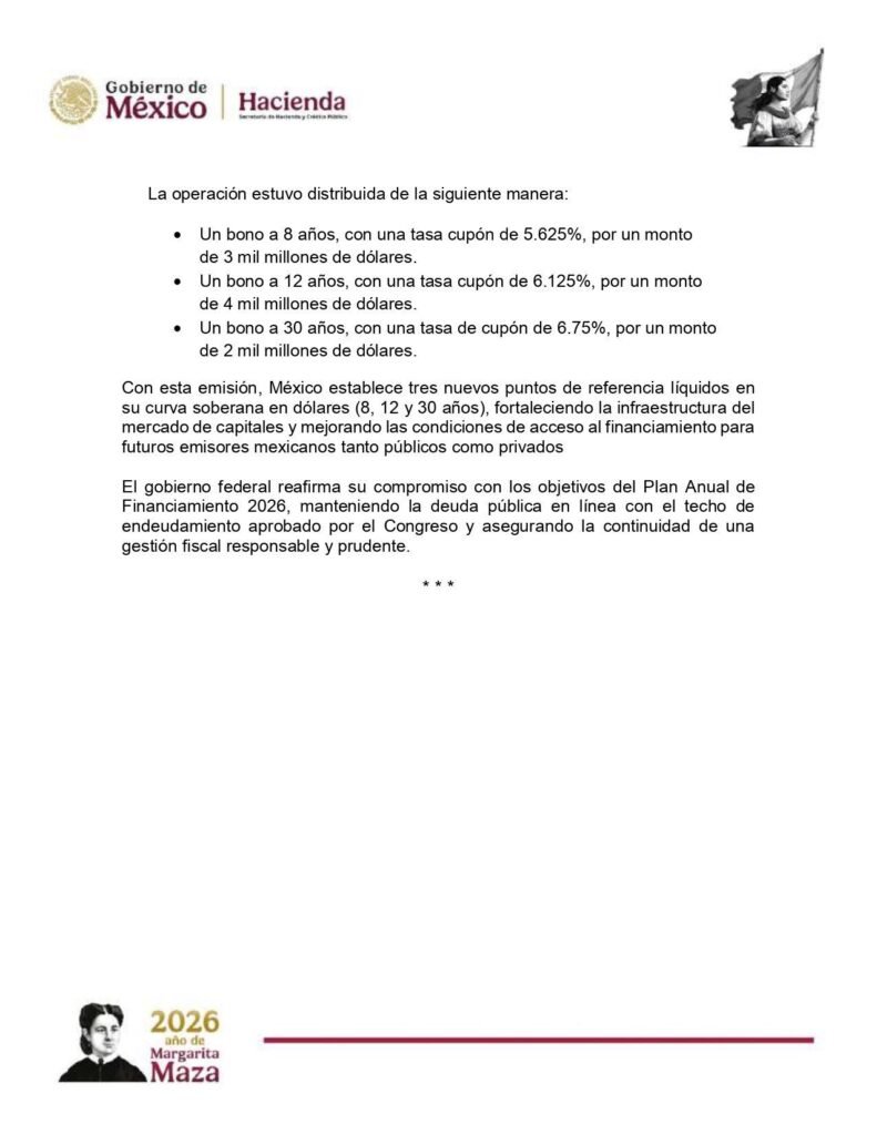 El gobierno federal de México, a través de la Secretaría de Hacienda y Crédito Público (SHCP), anunció este lunes 5 de enero la colocación de 9 mil millones de dólares en bonos emitidos en los mercados internacionales, marcando una de las emisiones más importantes del inicio del año y consolidando su estrategia de financiamiento externo para 2026.