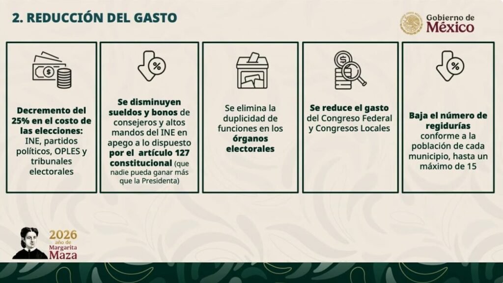 Uno de los ejes centrales de la iniciativa es la reducción del gasto. El Ejecutivo propone disminuir en 25 por ciento el costo de las elecciones, incluyendo al Instituto Nacional Electoral, a los partidos políticos, a los Organismos Públicos Locales Electorales y a los tribunales electorales. De acuerdo con los datos expuestos por Pablo Gómez, el sistema electoral mexicano tuvo un costo aproximado de 61 mil millones de pesos en 2024, lo que, afirmó, lo ubica entre los más caros del mundo. La reforma contempla ajustar sueldos y bonos de consejeros y altos mandos del INE conforme al artículo 127 constitucional, que establece que ningún servidor público puede percibir un salario mayor al de la Presidencia, así como eliminar duplicidades administrativas y reducir el gasto tanto del Congreso federal como de los congresos locales. También se plantea disminuir el número de regidurías en los ayuntamientos, estableciendo un máximo de 15 dependiendo del tamaño poblacional.