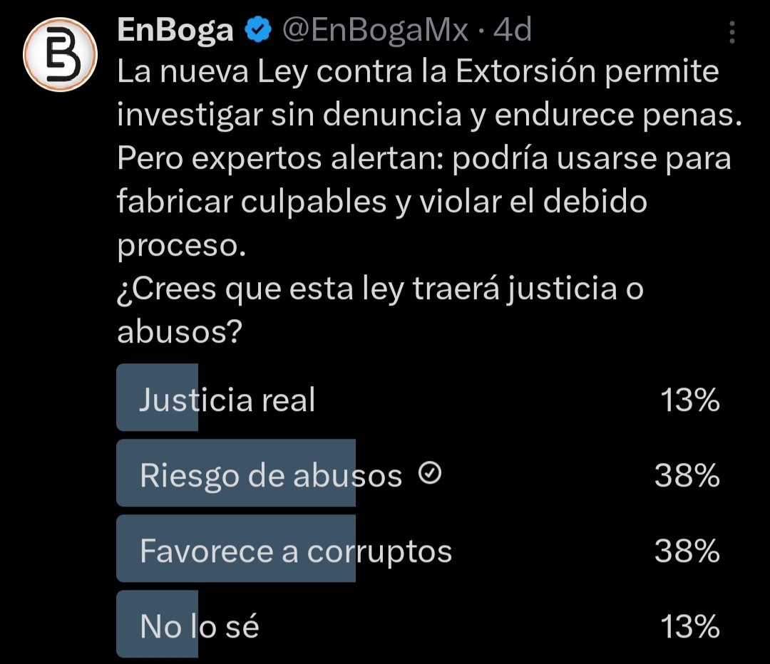 Una encuesta reciente realizada por EnBoga arroja una respuesta contundente del público sobre la recién aprobada legislación en materia de extorsión. A la pregunta “La nueva Ley contra la Extorsión permite investigar sin denuncia y endurece penas. Pero expertos alertan: podría usarse para fabricar culpables y violar el debido proceso. ¿Crees que esta ley traerá justicia o abusos?”, el 13 % de los consultados respondió que traerá “justicia real”, mientras un 38 % opinó que hay “riesgo de abusos”, otro 38 % que “favorece a corruptos” y el 13 % admitió no saber (o no tener opinión).