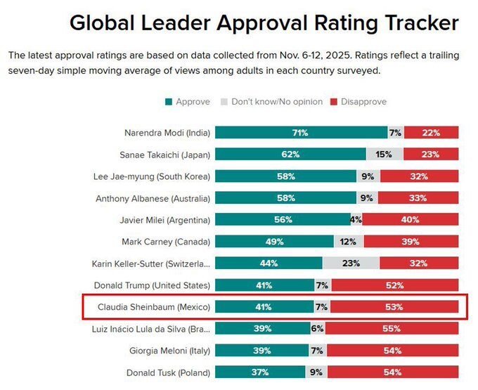 Esta encuesta se suma a la encuesta publicada por Morning Consult el mes pasado –la misma encuesta que AMLO presumía–, la cual señala que el 53% de los mexicanos desaprueba su trabajo, lo que la ubica como una de las mandatarias con mayor desaprobación.
