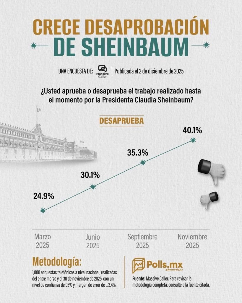 La más reciente encuesta de Massive Caller, publicada el 2 de diciembre de 2025, revela un giro preocupante para la administración de Claudia Sheinbaum. Según el sondeo, la desaprobación del desempeño de la presidenta alcanzó el 40.1 % hacia finales de noviembre, una cifra que contrasta de forma notable con el 24.9 % registrado en marzo de este mismo año.
