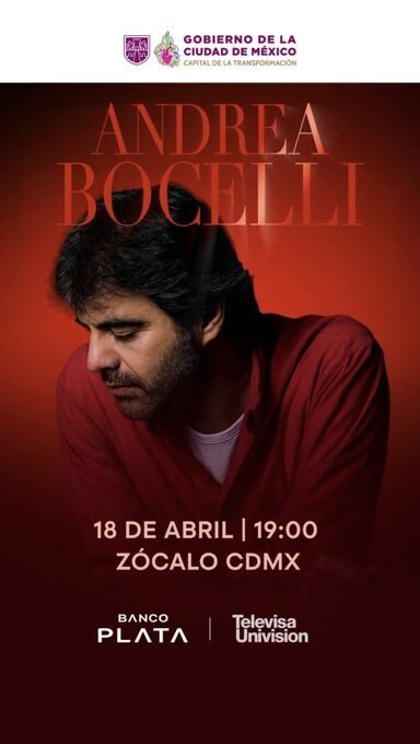 Amigas y amigos, el próximo sábado 18 de abril estará en el corazón de la Ciudad de México @AndreaBocelli, quien ofrecerá un concierto único en su género y contará con la participación especial de invitados sorpresa. Como siempre, el acceso será gratuito.