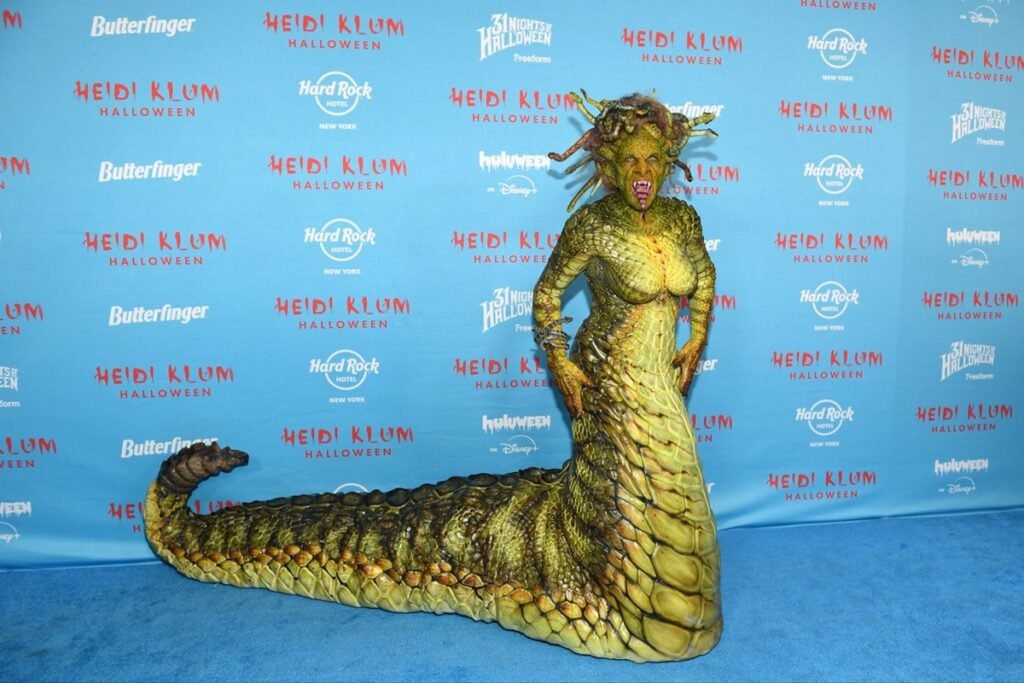 Para su tradicional fiesta anual de disfraces, Heidi Klum se inspiró en la figura mitológica de Medusa. La supermodelo lució un traje a la medida completamente verde, cubierto de escamas y una larga cola de serpiente, y un tocado con serpientes mecánicas que se movían de forma autónoma. Según medios como AP y Vogue, Klum declaró: “Quería ser de verdad una Medusa feísima, muy fea, y siento que lo conseguimos al 100 %”.