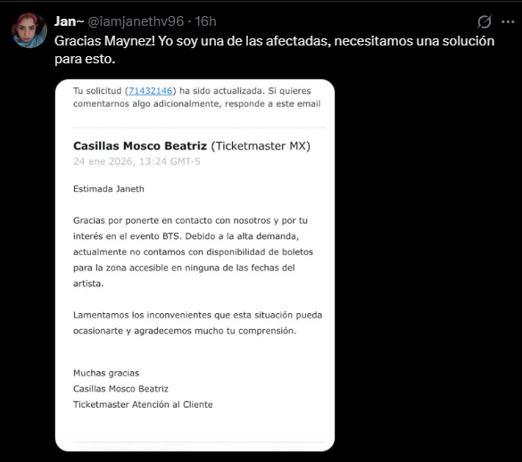 Este lance se da en medio de una intensa ola de quejas públicas que han rodeado la venta de entradas para los conciertos de BTS. La preventa, caracterizada por fallas técnicas, colapsos en los servidores y largas filas virtuales, ha dejado a millones de fans sin acceso a boletos y ha motivado denuncias tanto ante la Procuraduría Federal del Consumidor (Profeco) —donde Máynez y seguidores han documentado irregularidades adicionales relacionadas con la preventa exclusiva para miembros de ARMY— como, ahora, ante el CONAPRED por posibles violaciones a derechos de inclusión y no discriminación.