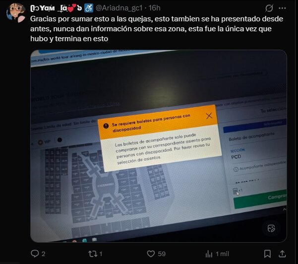 La acción legal, ingresada el 26 de enero de 2026, se sustenta en la denuncia de que el sistema de venta de boletos habilitado para la serie de conciertos programados para mayo —7, 9 y 10— en el Estadio GNP Seguros, contiene condiciones que encarecen y restringen el acceso de personas con discapacidad. Según acusa Máynez, en la sección etiquetada como “Personas con Discapacidad” el sistema obliga a adquirir simultáneamente un boleto de acompañante indispensable, ambos con el mismo precio elevado, y además, no permite seleccionar ninguna localidad, mostrando constantemente disponibilidad en “0”, lo que impide de facto la compra de estos boletos por parte de este sector del público.
