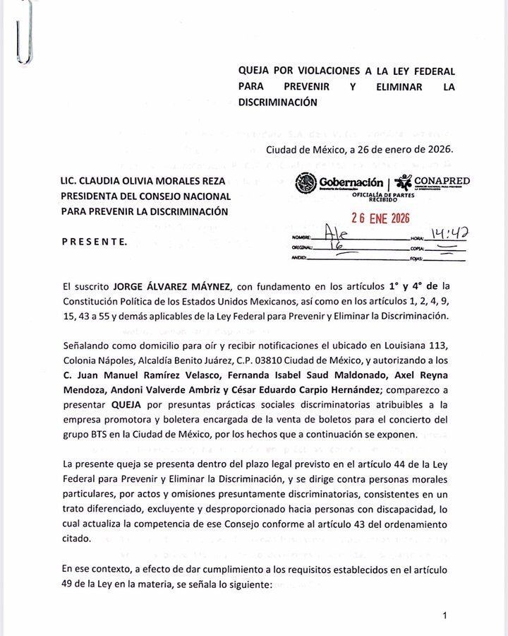 En un nuevo capítulo dentro de la controversia generada por la venta de boletos para los conciertos de la banda surcoreana BTS en Ciudad de México, el coordinador nacional de Movimiento Ciudadano (MC), Jorge Álvarez Máynez, presentó este lunes una queja formal ante el Consejo Nacional para Prevenir la Discriminación (CONAPRED) en contra de las empresas Ticketmaster y OCESA, por presuntas prácticas discriminatorias que afectarían a personas con discapacidad durante el proceso de adquisición de entradas.