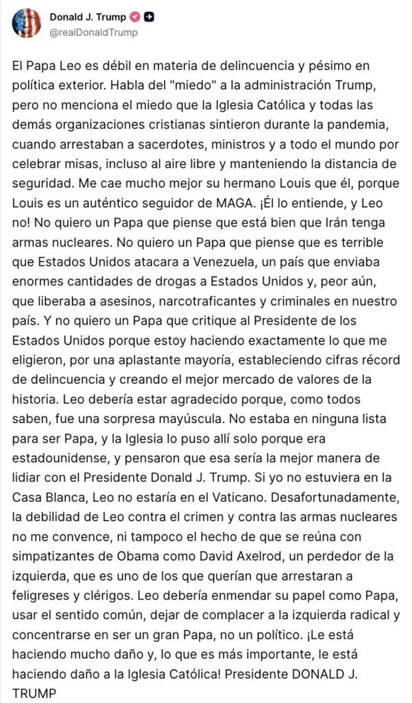 “El papa León es débil con el crimen y terrible en política exterior. No quiero un papa que piense que está bien que Irán tenga un arma nuclear”, escribió el presidente, en un mensaje que no solo critica la posición del Vaticano sobre el conflicto, sino que también vincula al pontífice con un posicionamiento ideológico contrario a su administración.
