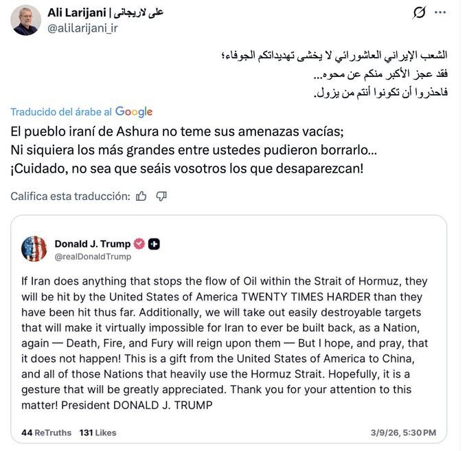 A través de redes sociales, el funcionario iraní desestimó las advertencias de Washington y lanzó un mensaje contundente dirigido al mandatario estadounidense. “El pueblo iraní de Ashura no teme sus amenazas vacías”, escribió Larijani, en alusión a la tradición chiita que exalta el sacrificio y la resistencia, antes de advertir: “Cuidado, no vaya a ser que sean ustedes los que desaparezcan”.