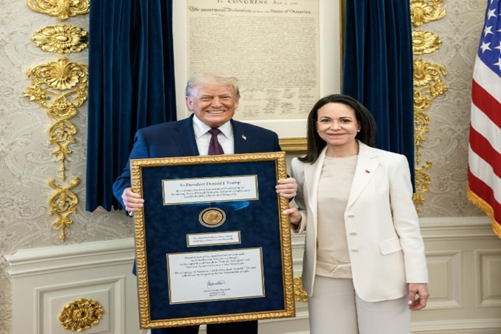 La líder opositora calificó el gesto como “un reconocimiento a su compromiso único con nuestra libertad”, mientras que Trump describió el acto como “maravilloso”, según declaraciones difundidas tras la reunión.