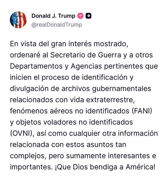 "En vista del gran interés mostrado, ordenaré al Secretario de Guerra y a otros departamentos y agencias pertinentes que inicien el proceso de identificación y divulgación de archivos gubernamentales relacionados con vida extraterrestre, fenómenos aéreos no identificados (FANI) y… pic.twitter.com/dFIackxPHQ
