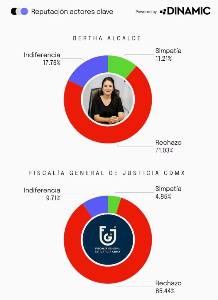 Las cifras del análisis digital son contundentes. La Fiscalía de la Ciudad de México acumula un 85.44 por ciento de rechazo en redes sociales, posicionándose como una de las instituciones peor evaluadas por los usuarios. En contraste, apenas un 4.85 por ciento de las menciones reflejan una percepción positiva, mientras que un 9.71 por ciento se mantiene en la neutralidad. Este comportamiento evidencia un clima de desaprobación extendido, alimentado por la indignación social ante el caso y la percepción de fallas sistemáticas en la procuración de justicia.