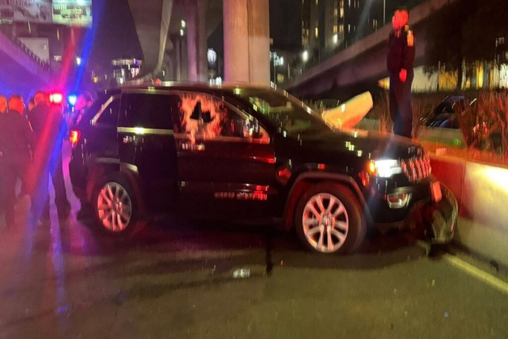 Imágenes que circulan en redes sociales muestran la camioneta de color oscuro con múltiples impactos de bala en el cristal de la puerta del conductor, el cual aparece estrellado y perforado por los disparos.