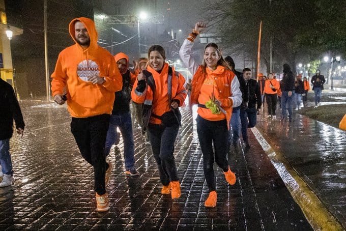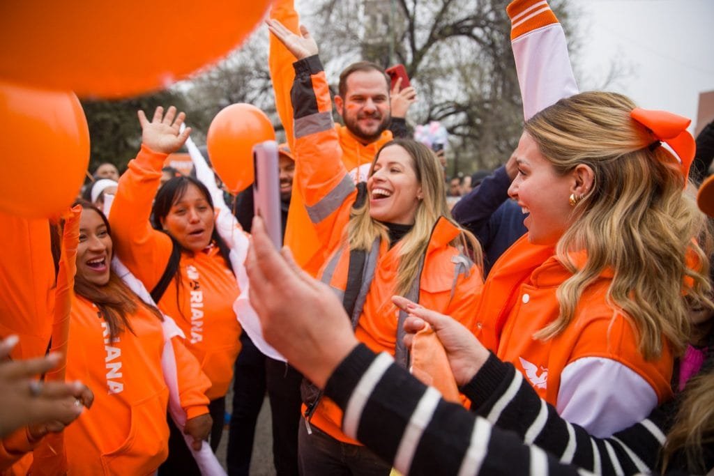 A pesar del frío y lluvia, miles de simpatizantes y militantes del partido vestidos de naranja se dieron cita en el lugar, donde además hubo globos, batucada y zanqueros de circo.
