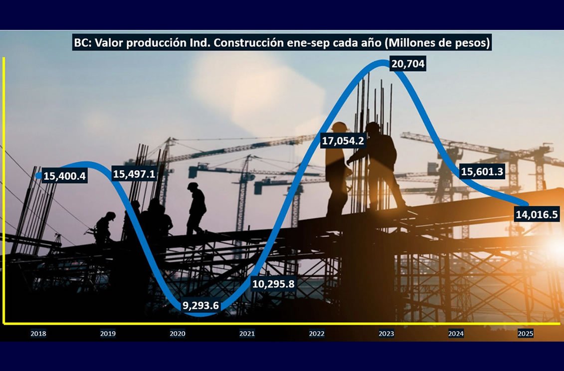 La industria de la construcción en Baja California atraviesa su momento más crítico en los últimos cuatro años. Las cifras del Instituto Nacional de Estadística y Geografía (INEGI) revelan una caída del 10.2% en el valor de producción durante los primeros nueve meses de 2025 comparado con el mismo periodo del año anterior.