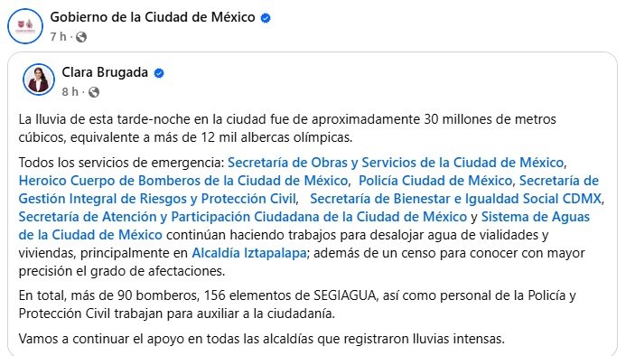 Por su parte, la jefa de gobierno Clara Brugada, a través de su cuenta oficial de X (antes Twitter) dio a conocer que el día de ayer la lluvia en la ciudad fue de aproximadamente 30 millones de metros cúbicos, equivalente a más de 12 mil albercas olímpicas.