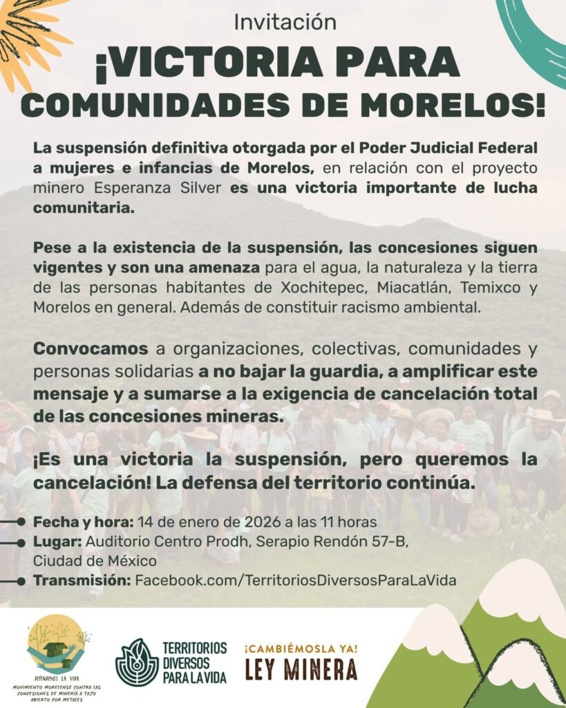 La organización Territorios Diversos para la Vida, que acompaña el proceso, explicó que mientras la comunidad busca ampliar la suspensión para frenar también la exploración minera, la Secretaría de Economía intenta anular la medida cautelar. El expediente ya se encuentra en manos del Segundo Tribunal Colegiado de Distrito en Morelos, que deberá resolver sobre la legalidad de la suspensión definitiva.