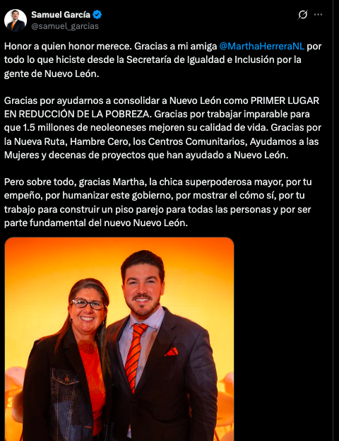 El gobernador de Nuevo León, Samuel García Sepúlveda, abrió la puerta a una eventual candidatura de Martha Herrera González para la alcaldía de Monterrey por Movimiento Ciudadano, en el marco de la toma de protesta de los círculos ciudadanos del partido realizada este sábado en la capital regiomontana