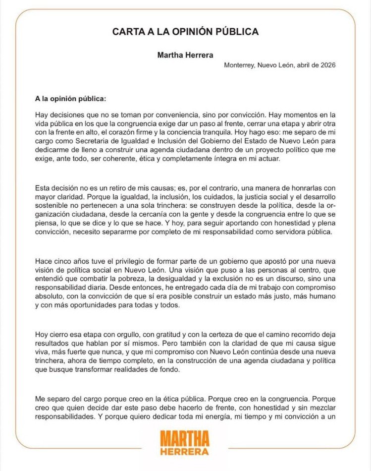 Herrera explicó previamente que su renuncia respondió a la intención de dedicarse de lleno a la conformación de una agenda ciudadana con miras a un proyecto político de largo plazo. A través de un mensaje público, sostuvo que su decisión se basa en principios de ética y congruencia, al considerar necesario separar por completo sus responsabilidades como funcionaria de cualquier aspiración política.