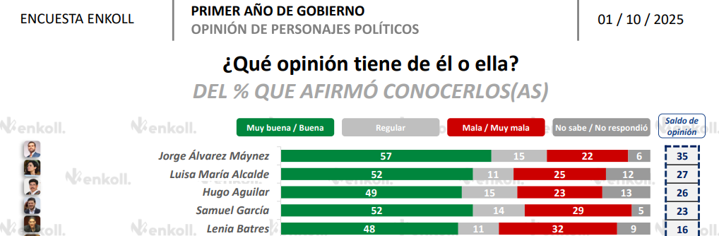 El primer sitio lo ocupa el excandidato presidencial y también emecista Jorge Álvarez Máynez, quien registró un 57% de evaluación favorable, consolidando su ascenso tras las elecciones de 2024.