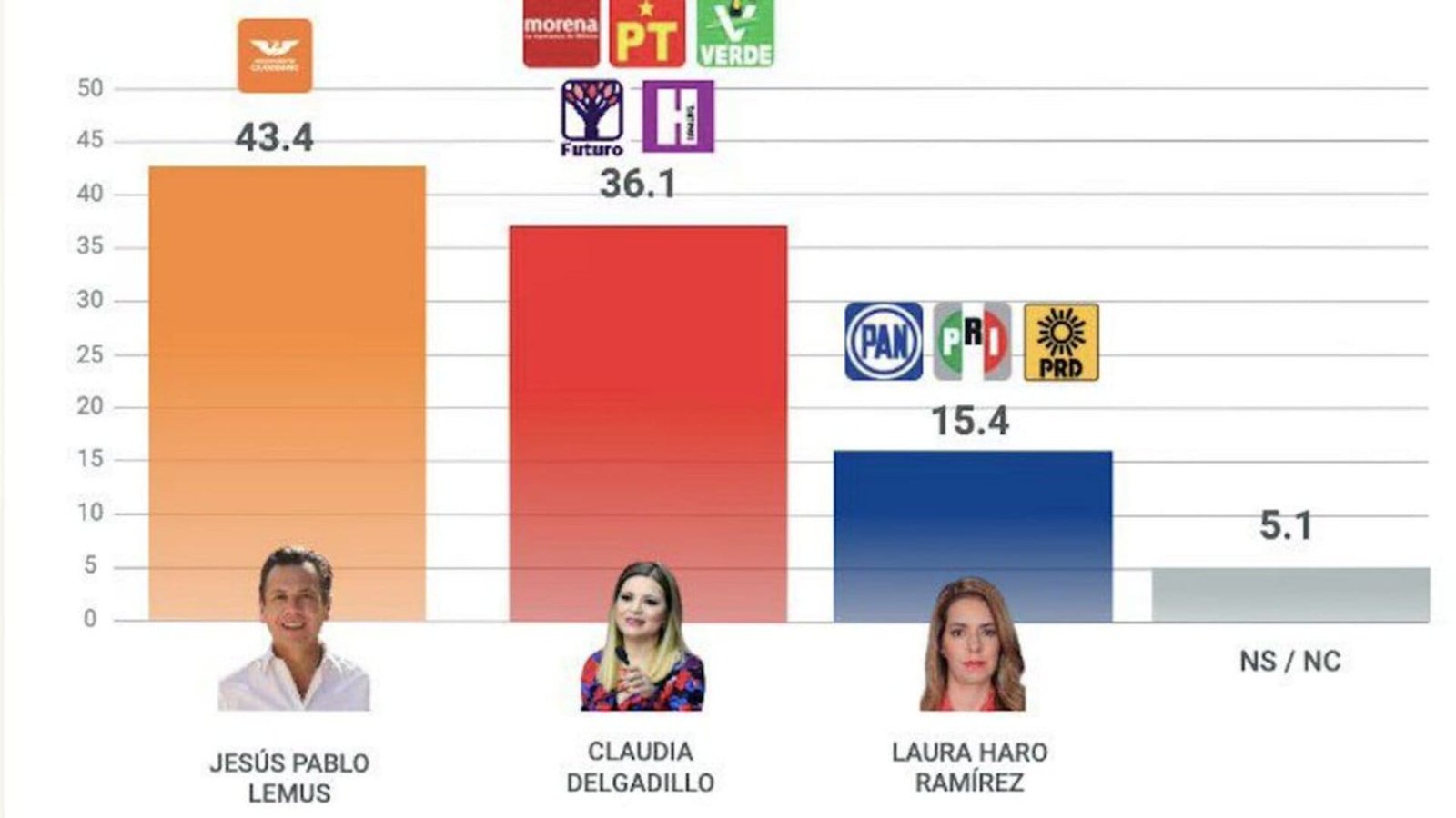 En promedio con todas ellas, Pablo Lemus presenta un 45.08% de las preferencias electorales, frente a un 36.11% de Claudia Delgadillo y un 10.9% de Laura Haro.