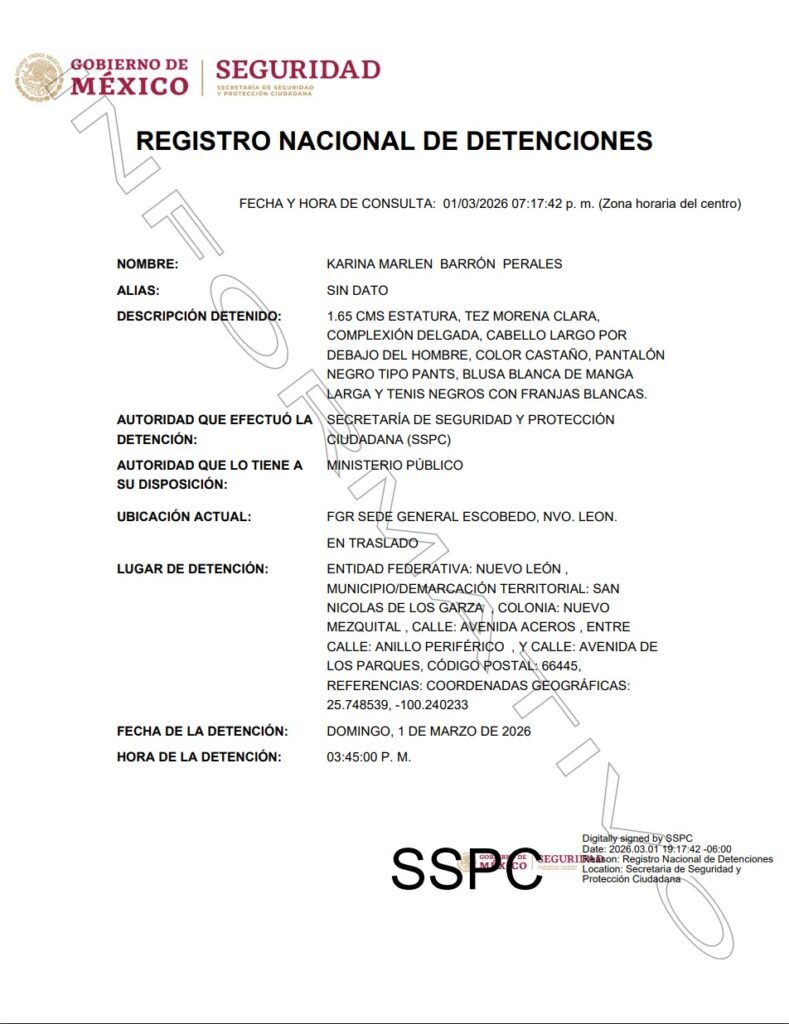La aprehensión de Karina Barrón se registró aproximadamente a las 15:45 horas en la colonia Nuevo Mezquital, tras un operativo coordinado por fuerzas federales. Según la ficha del Registro Nacional de Detenciones, la funcionaria fue interceptada en la vía pública y trasladada de inmediato a las instalaciones de la delegación estatal de la FGR en el municipio de Escobedo. Hasta el momento de su captura, Barrón se mantenía activa en sus funciones dentro del gabinete del alcalde Adrián de la Garza, habiendo participado en eventos públicos apenas el día anterior.
