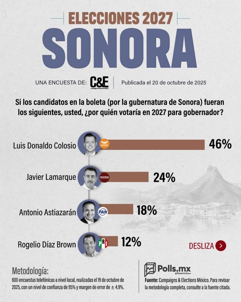 Con este resultado, el senador de Movimiento Ciudadano se perfila como el posible protagonista de la elección de 2027, ya sea encabezando su propio proyecto o integrándose a una alianza de mayor alcance. Lo cierto es que, aL día de hoy, Luis Donaldo Colosio Riojas es el favorito indiscutible para convertirse en el próximo gobernador de Sonora si así lo decidiera.