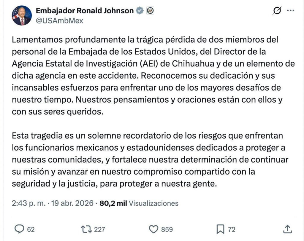 Por su parte, el embajador de Estados Unidos en México, Ronald Johnson, expresó sus condolencias por el fallecimiento de los funcionarios y agentes, y destacó la colaboración bilateral en materia de seguridad. A través de un mensaje oficial, reconoció el trabajo conjunto entre ambos países para combatir redes del crimen organizado, especialmente en regiones donde operan estructuras dedicadas al narcotráfico.