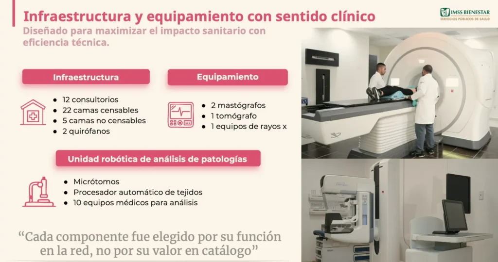 El hospital cuenta con 12 consultorios, dos quirófanos, salas de quimioterapia equipadas con 20 sillones y un tomógrafo de alta precisión. Además, se ha reforzado la plantilla con especialistas en oncología, hematología y ginecología para ofrecer un acompañamiento integral que incluye, en etapas posteriores, la referencia para reconstrucción mamaria gratuita.