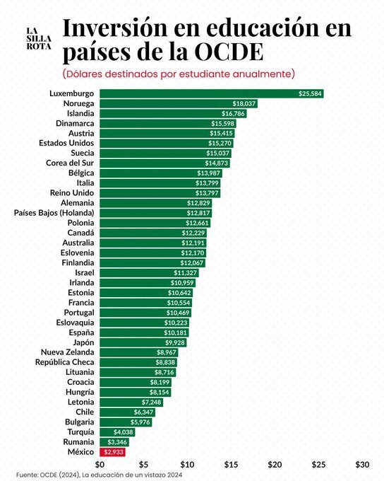 En el más reciente diagnóstico internacional sobre gasto educativo, México vuelve a ocupar el último lugar entre los países miembros de la Organización para la Cooperación y el Desarrollo Económicos (OCDE). Según un reciente análisis difundido por La Silla Rota, el país registra la inversión por estudiante más baja del organismo, lo que expone una profunda debilidad estructural en su sistema educativo, marcada por una asignación presupuestal insuficiente, una distribución interna distorsionada y un deterioro sostenido en cobertura, infraestructura y aprendizajes.