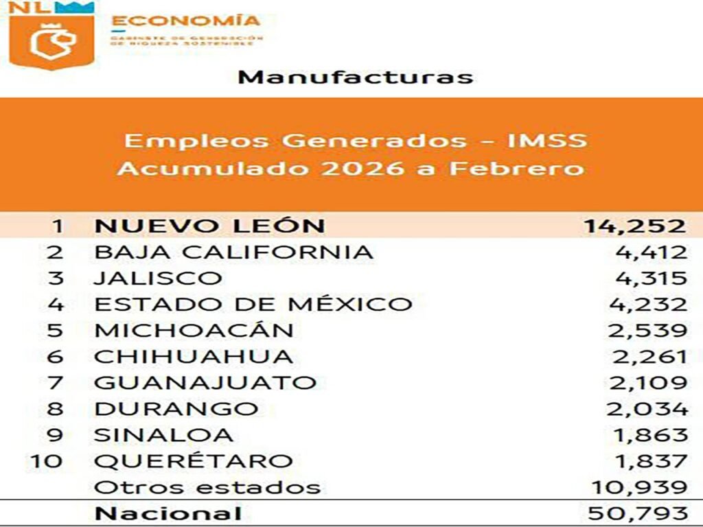 Nuevo León se colocó como la entidad con mayor generación de empleo en los sectores manufacturero y de servicios en México durante el inicio de 2026, de acuerdo con cifras oficiales del Instituto Mexicano del Seguro Social (IMSS), consolidando el peso industrial y económico del estado en el mercado laboral nacional