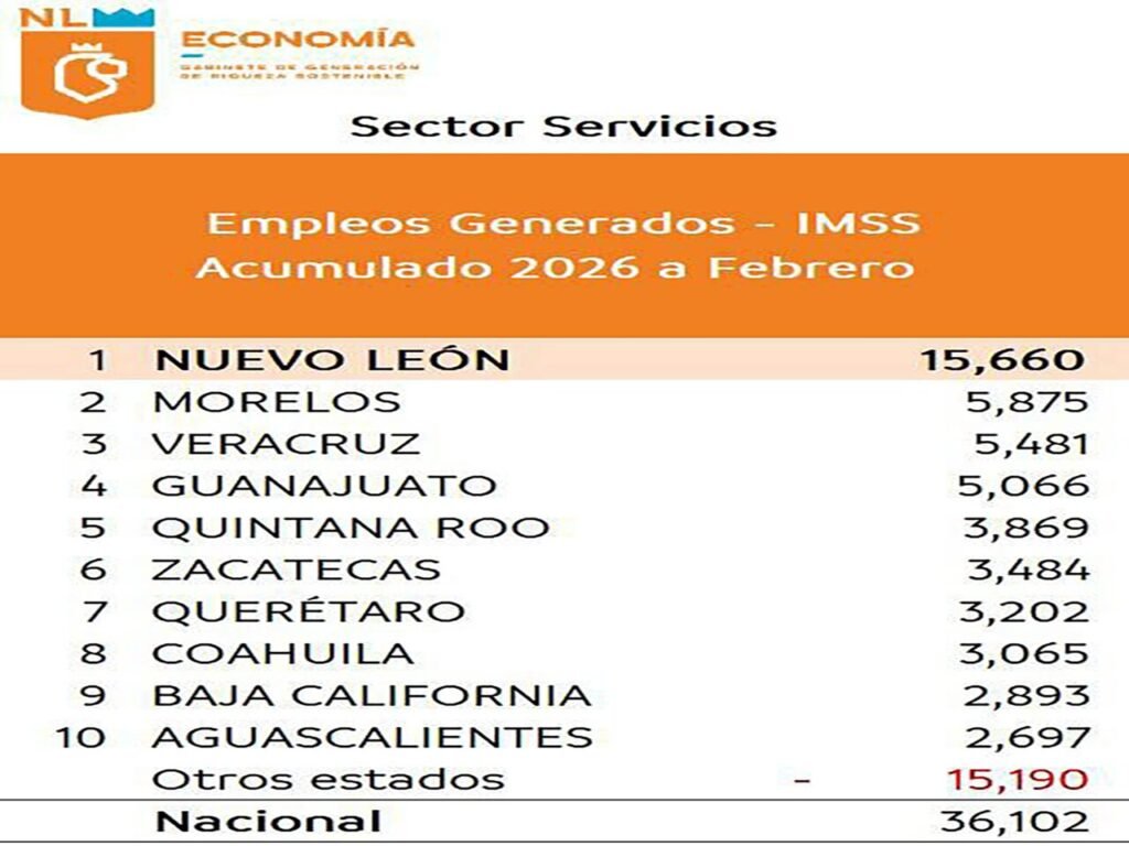 El desempeño del sector servicios también posicionó a Nuevo León en el primer lugar nacional. Entre enero y febrero de este año, la entidad sumó 15 mil 660 nuevos empleos en actividades vinculadas a comercio, logística, servicios empresariales y otros segmentos del sector terciario. Con esta cifra, el estado superó a entidades como Morelos, Veracruz y Guanajuato, que ocuparon los siguientes lugares en generación de empleo en este rubro.