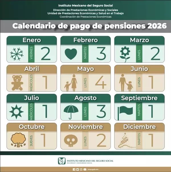 Para facilitar la planeación financiera, el IMSS estableció las siguientes fechas de pago para la pensión durante 2026: