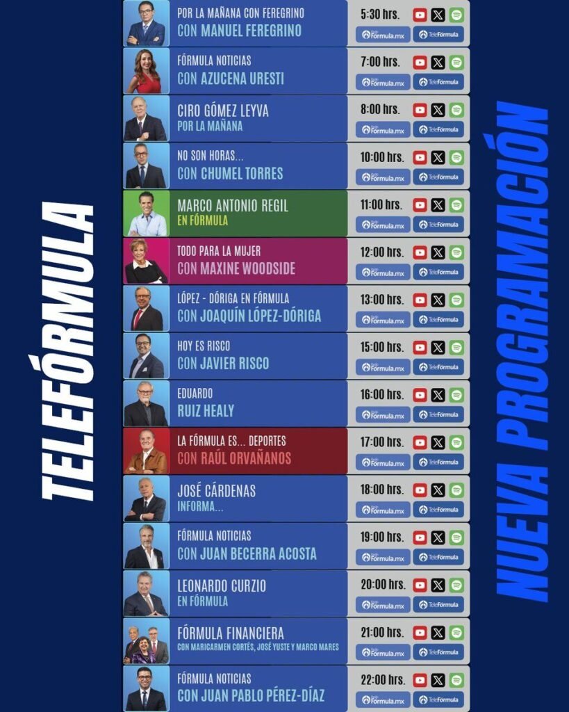 En televisión, la señal de TeleFórmula también experimenta una reorganización orientada a dar mayor cabida a talentos en formatos de una hora. En esta nueva distribución destacan espacios encabezados por figuras como Azucena Uresti en la franja matutina, así como la participación de Javier Risco y Juan Becerra Acosta en horarios estratégicos de la tarde y noche, respectivamente.