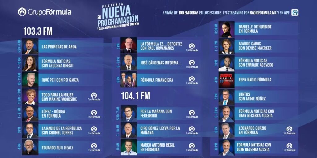 Bajo el lema “Damos poder a tu voz”, Grupo Fórmula anunció una reestructuración integral de su barra programática en radio y televisión, con el objetivo de actualizar sus contenidos y responder a las nuevas dinámicas de consumo informativo y de entretenimiento de sus audiencias. Los cambios, que entraron en vigor el 6 de abril, implican ajustes de horario, incorporación de nuevos espacios y el fortalecimiento de perfiles ya consolidados en el ámbito periodístico y del análisis.