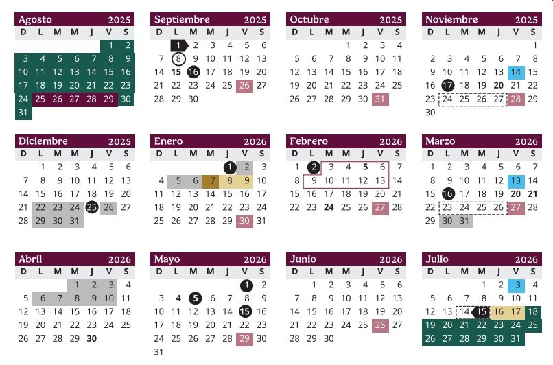 El calendario vigente establece 185 días efectivos de clase, por lo que la distribución de los recesos fue ajustada para este ciclo. El resultado fue un periodo vacacional de diciembre y enero más amplio, sin afectar el cumplimiento del plan académico anual.