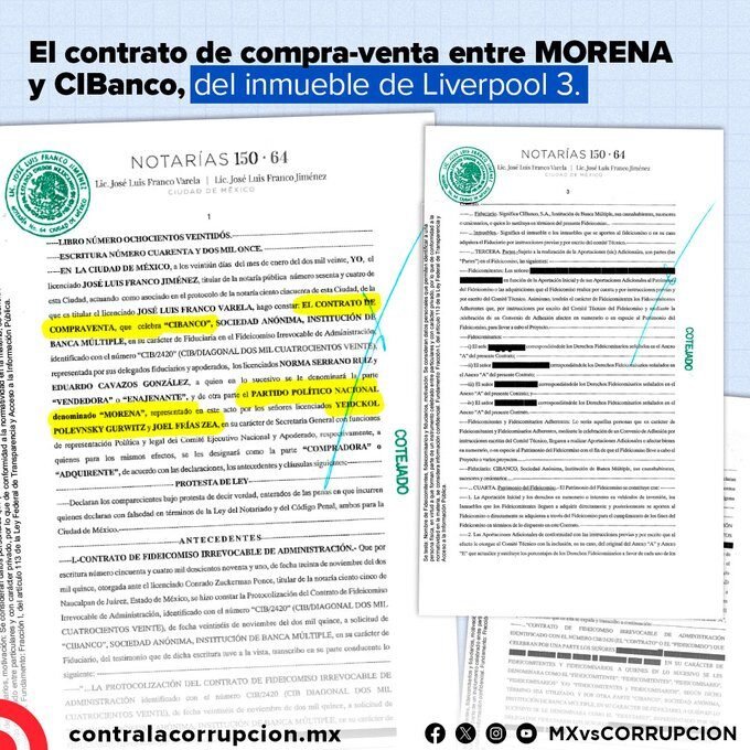 La revisión de los contratos de bienes y servicios de Morena entre 2019 y 2025 ubica la operación con CIBanco como la tercera de mayor monto en ese periodo, únicamente por debajo de acuerdos relacionados con las empresas Organización Portofino e Inmobiliaria MI-Calli, también vinculadas a operaciones inmobiliarias.