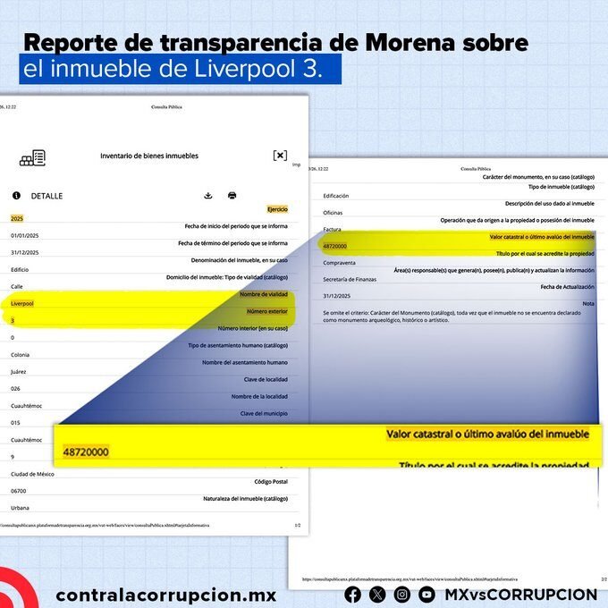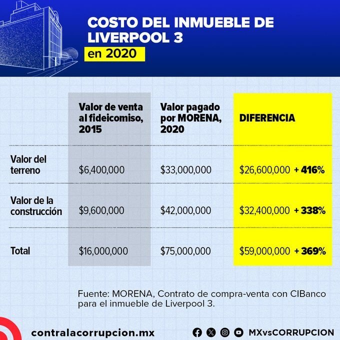 Una investigación de la organización Mexicanos Contra la Corrupción y la Impunidad documentó que el inmueble que actualmente ocupa la sede nacional de Morena, ubicado en la calle Liverpool 3, en la colonia Juárez de la Ciudad de México, fue adquirido en 2020 por 75 millones de pesos, pese a que cinco años antes había sido vendido a un fideicomiso por apenas 16 millones, lo que implica un incremento de 368 por ciento en su valor.