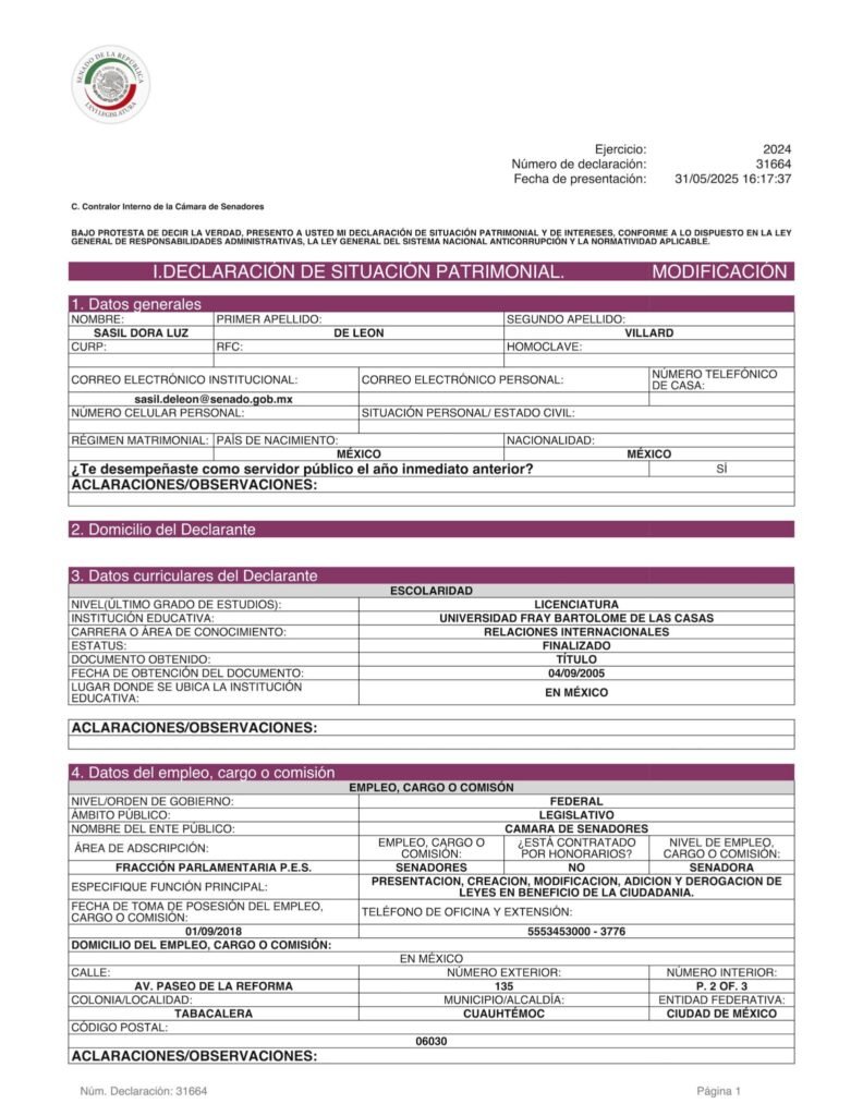 La senadora de Morena por Chiapas, Sasil Dora Luz de León Villard, aparece en el centro de un fuerte escrutinio luego de que su declaración patrimonial del ejercicio 2025 revelara la existencia de un crédito hipotecario por 330 millones de pesos. La senadora dice no poseer bienes muebles o inmuebles a su nombre, ni vehículos, y afirma vivir en una vivienda en comodato, lo que ha intensificado las interrogantes sobre la naturaleza y finalidad de este endeudamiento multimillonario